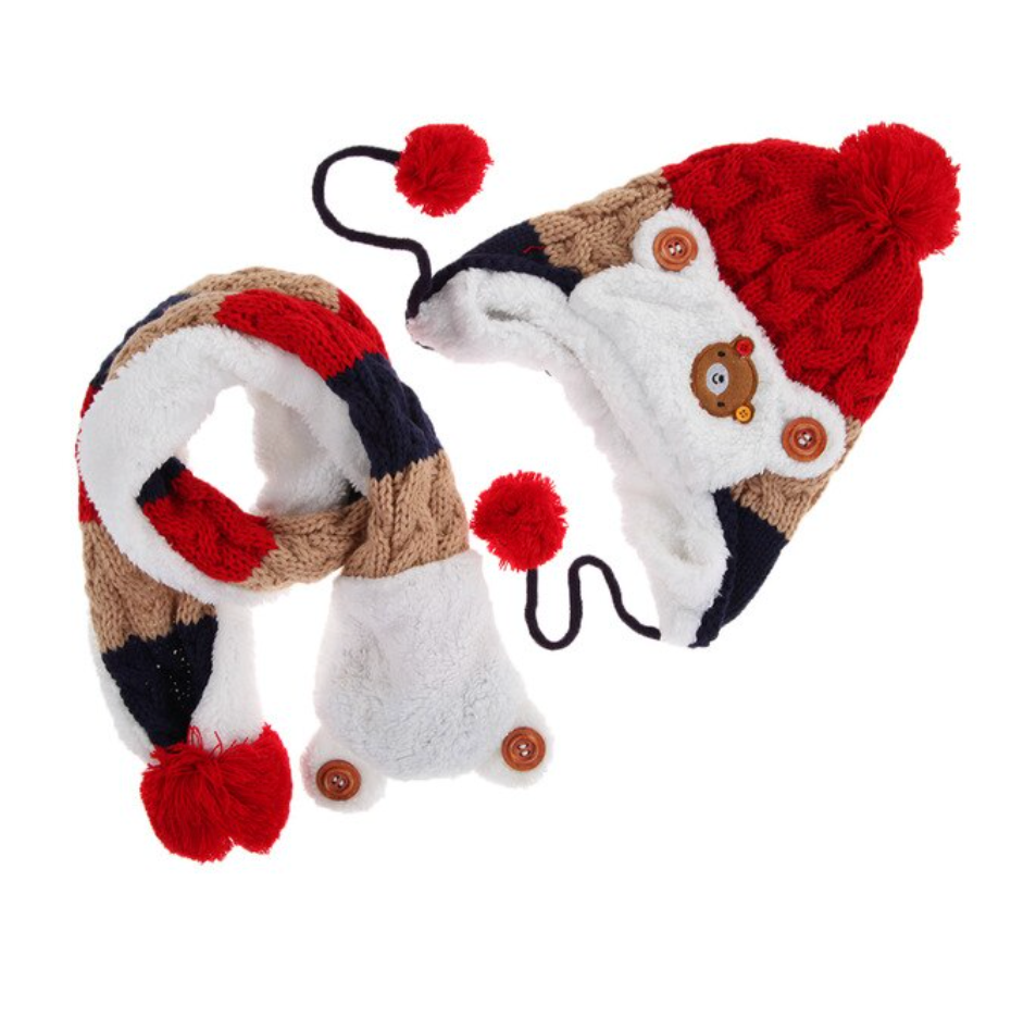Ce bonnet et cette écharpe sont en coton et en laine. Cet ensemble permet de garder la tête et le cou de votre enfant bien au chaud.